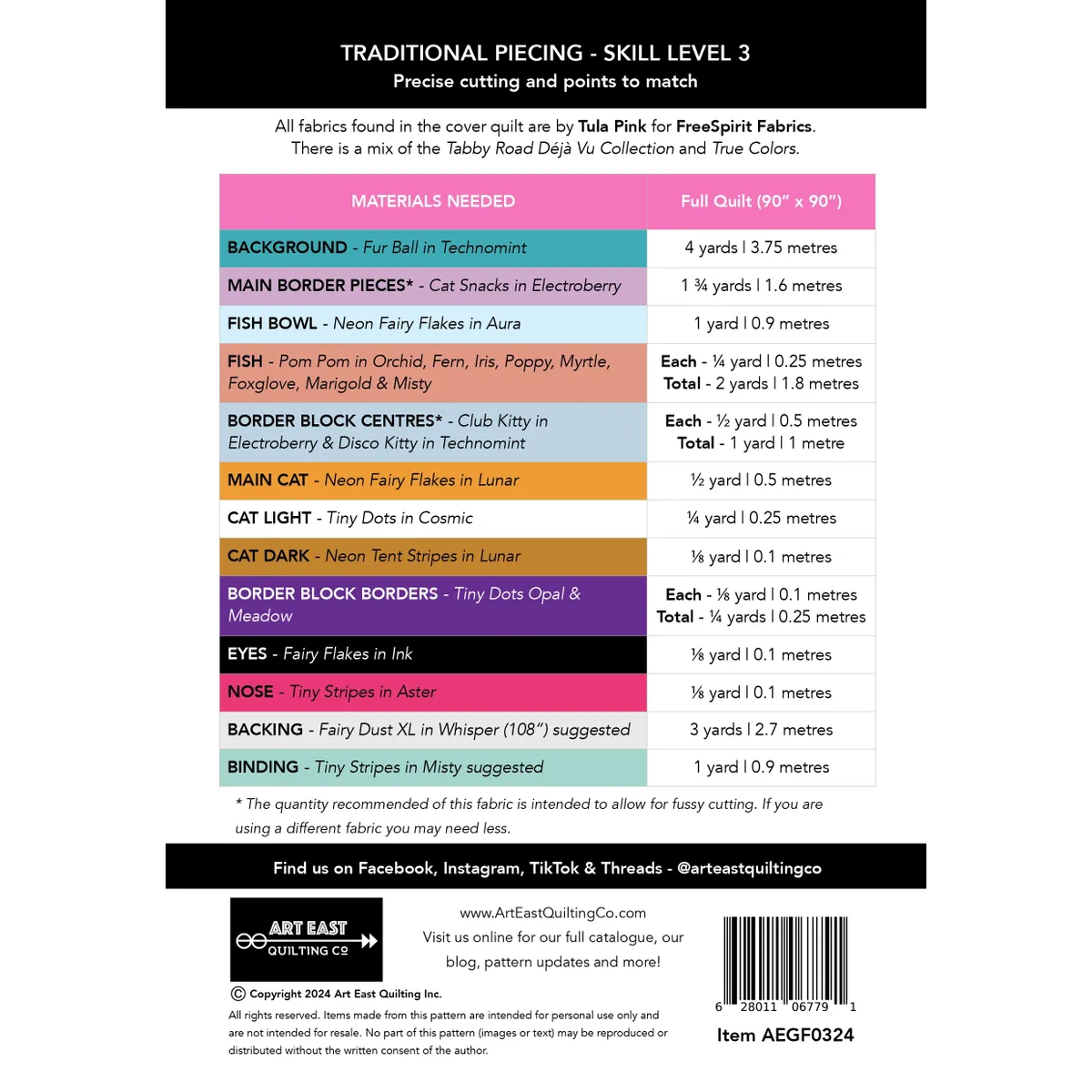 This pattern booklet includes detailed instructions to create a whimsical 90" x 90" quilt featuring a cat in a fishbowl design. The pattern is traditionally pieced and comes with fully illustrated diagrams and fabric layout cutting guides to help you make the most of your fabric. The centerpiece of the quilt, the cat in a fish bowl block, measures 40.5" x 40.5" and can also be made separately to create a smaller quilt.
