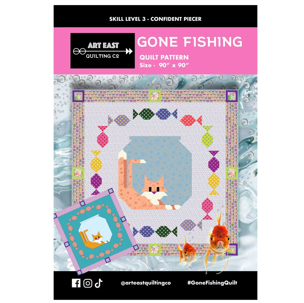 Introducing the Gone Fishing Pattern Booklet that showcases Tula Pink's Tabby Road Déjà Vu Collection. The pattern is perfect for confident piecers who have a knack for precise cutting, diagonal piecing, and matching points.