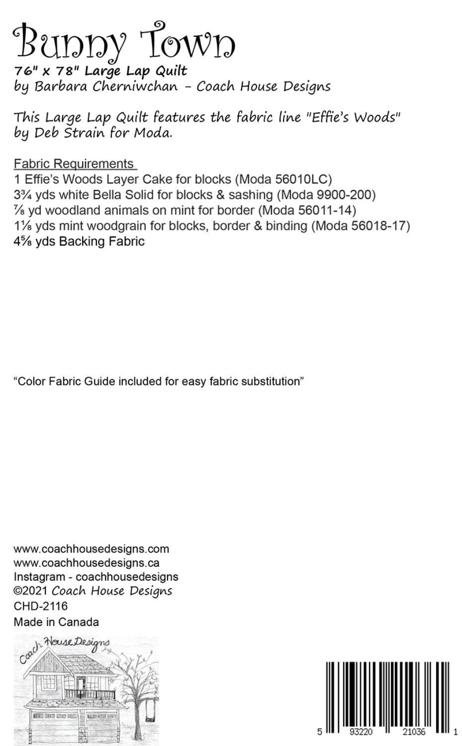 All pieced 76" x 78" bunny lap quilt which uses 1 Layer Cake. Pattern features Effie's Woods by Deb Strain for Moda. Suitable for any fabric.