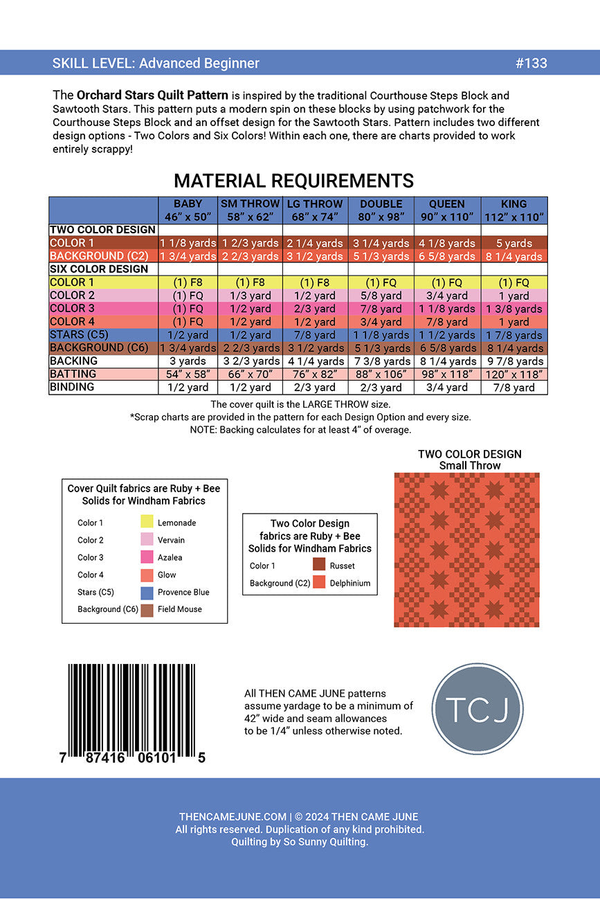 Pattern includes two different design options - Two Color and Six Colors! Within each one, there are charts provided to work entirely scrappy! The pattern includes six sizes from Baby to King! The cover sample is the Large Throw finishing at 68" x 74".